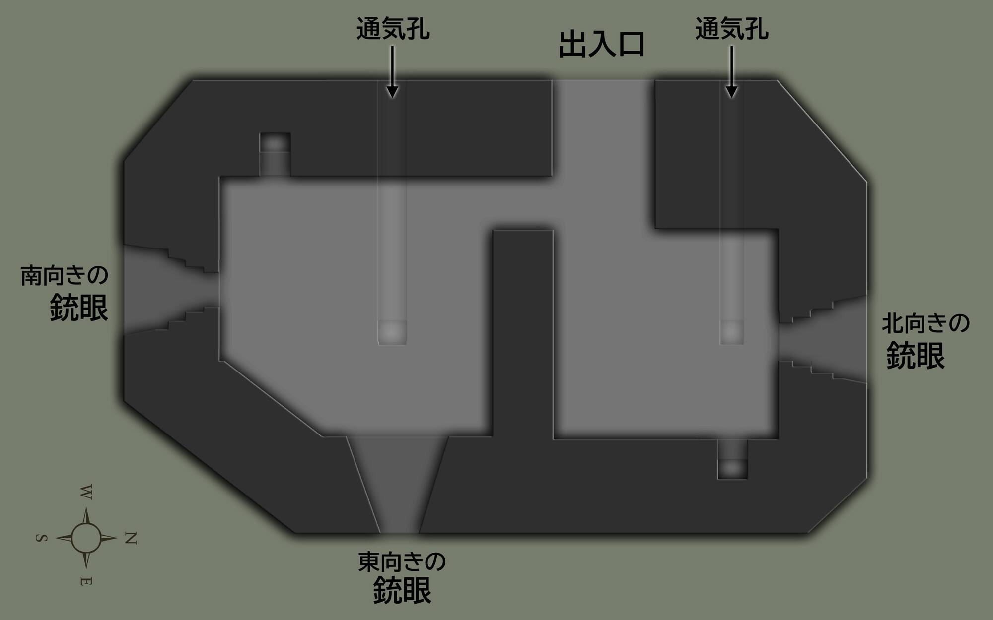 ※出入口が金網扉で塞がれおり、内部調査を行えない状況のため、同じ構造と考えられるエツキサイ防霧林トーチカや野塚防霧林北トーチカを参考に作成した。