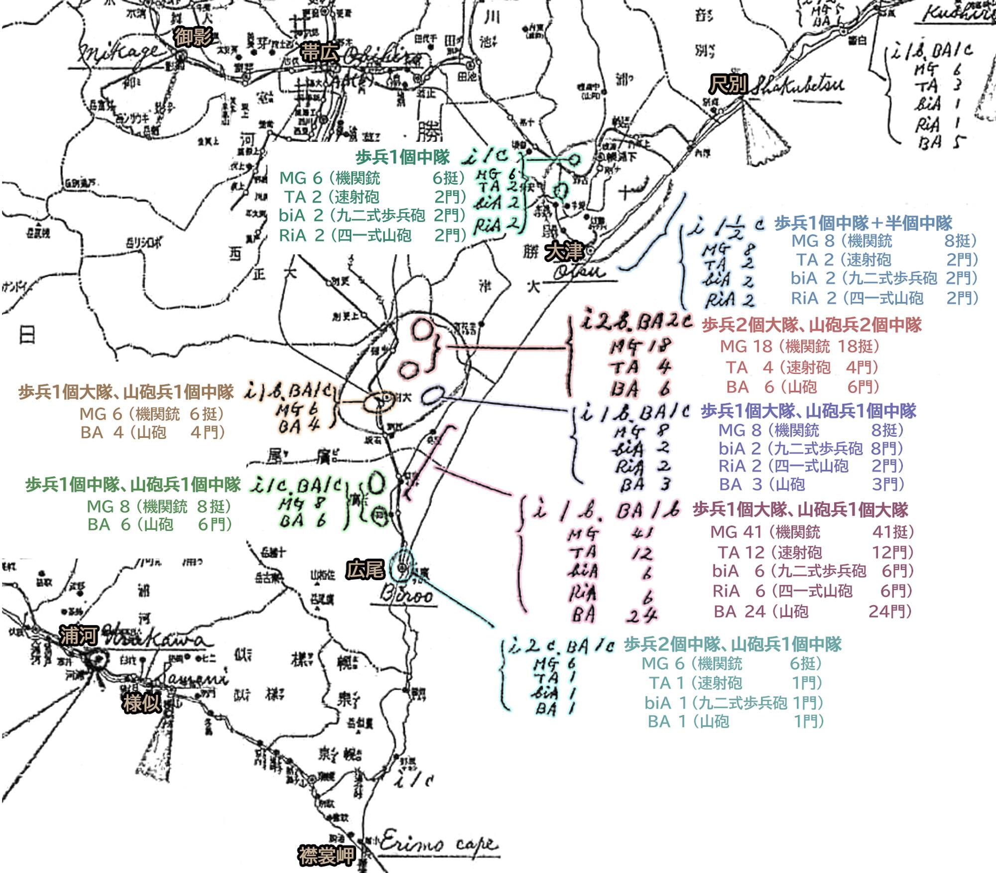 大野文明様より教えていただいた「田口英男資料」(次の図)を参照すると、大樹~広尾間の海岸付近には、i1b(歩兵1個大隊)とBA1b(山砲兵1個大隊)が配置され、MG(機関銃)41挺、TA(速射砲)12門、biA(大隊砲=九二式歩兵砲)6門、RiA(連隊砲=四一式山砲)6門、BA(その他の山砲)24門が配備されていたことが確認できる。これを参考に、このトーチカ用の火砲はどれなのかを検討してみたい。