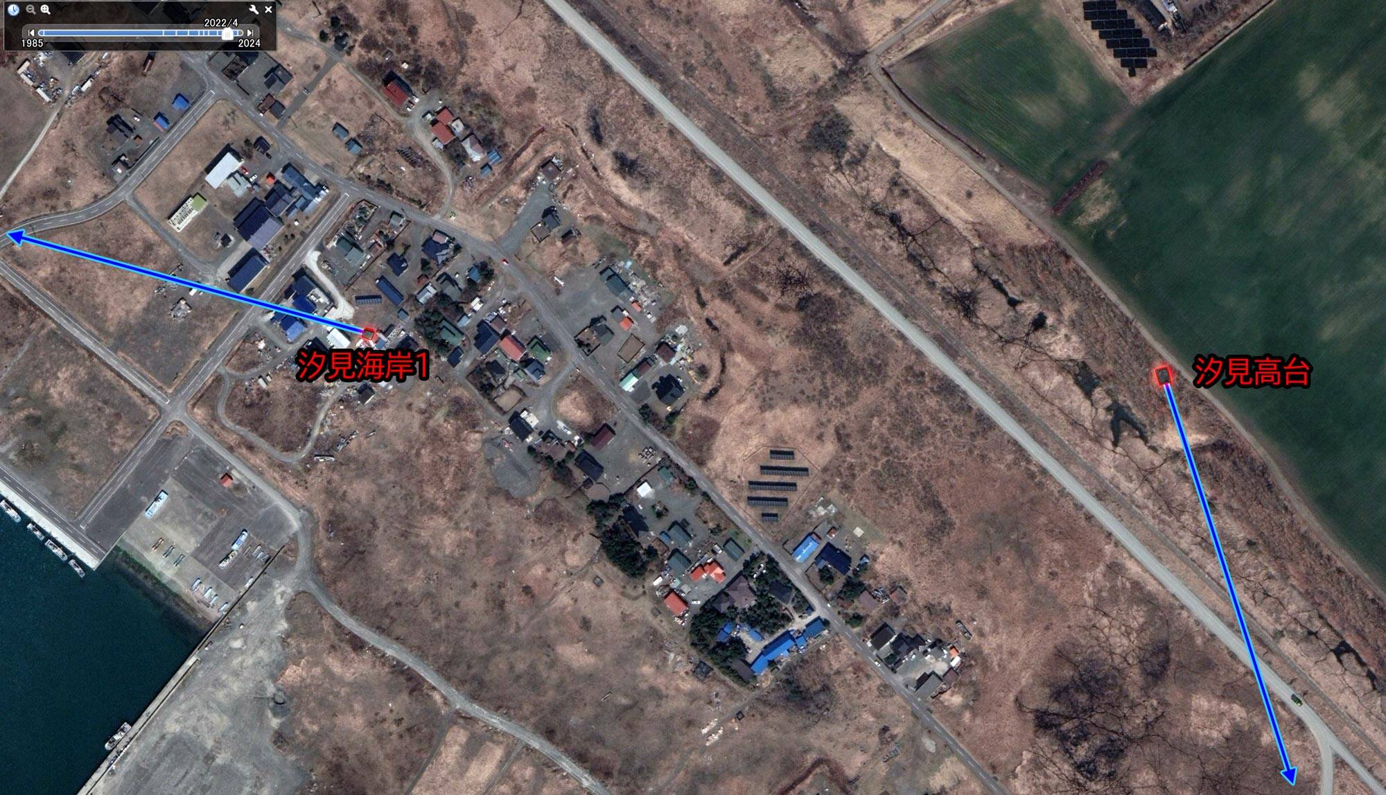 Google Earth Proの時間スライダで、2022年4月21日取得の衛星写真を表示すると、汐見高台トーチカの位置が明確に判別できる。