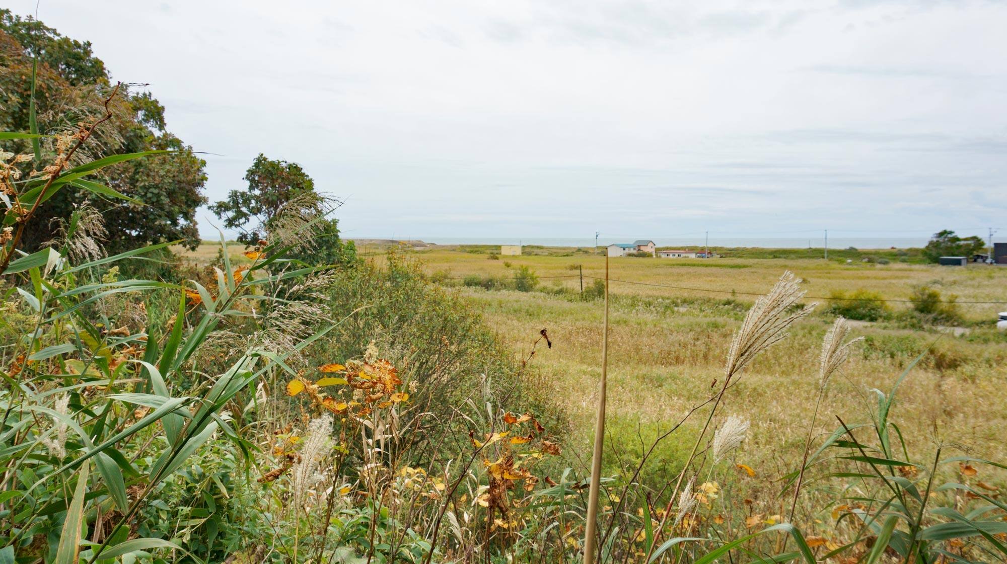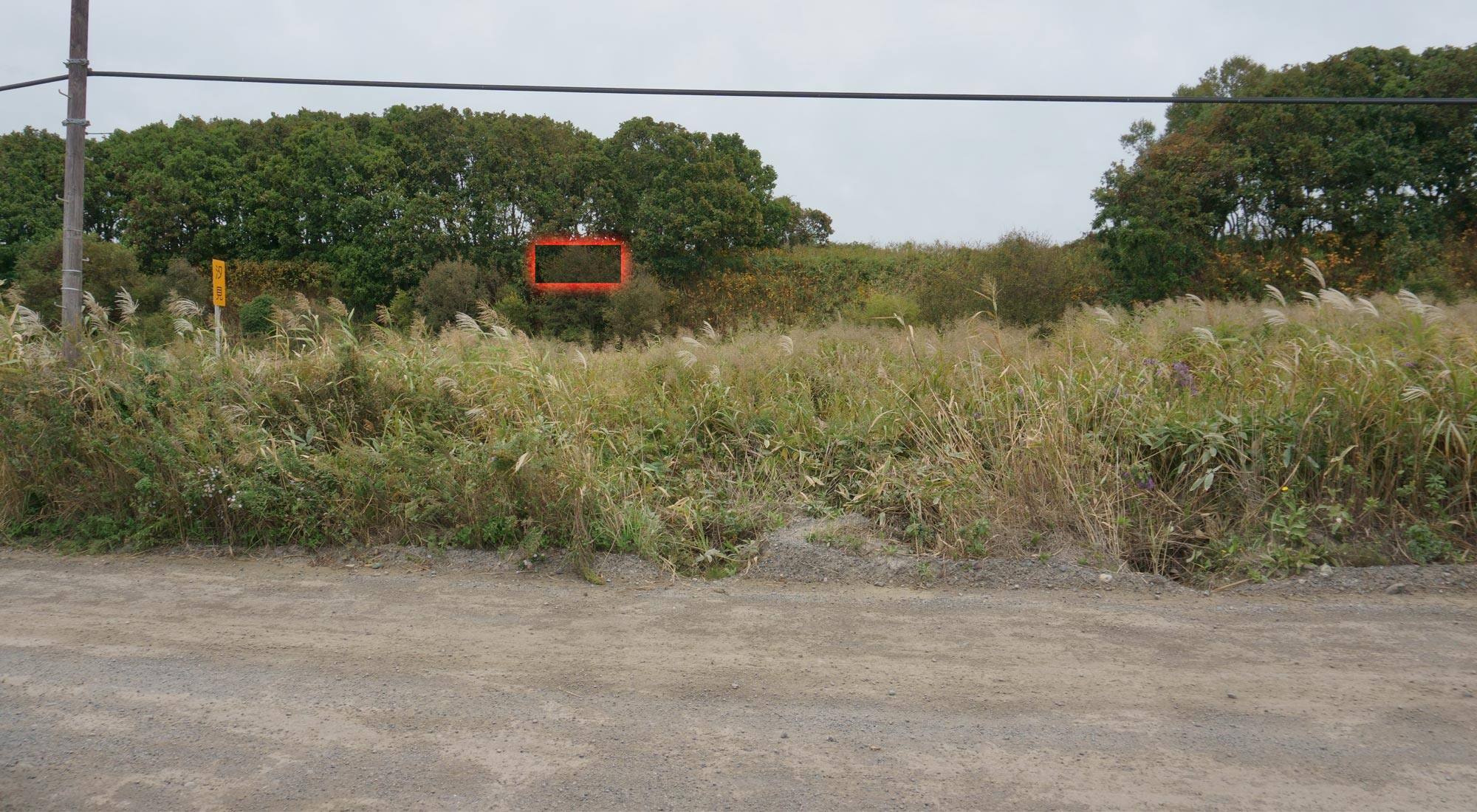 というわけで、現実的には旧線路沿いの砂利道から藪漕ぎをしていかなければならない。赤枠で囲んだあたりに、汐見高台トーチカが残存している。2m以上の高さのススキが繁茂しており、ぱっと見では分からないが、旧線路の先は湿地となっている。今回の調査では長靴で何とか通過できたが、場所によっては深くなっているため、細心の注意が必要である。
