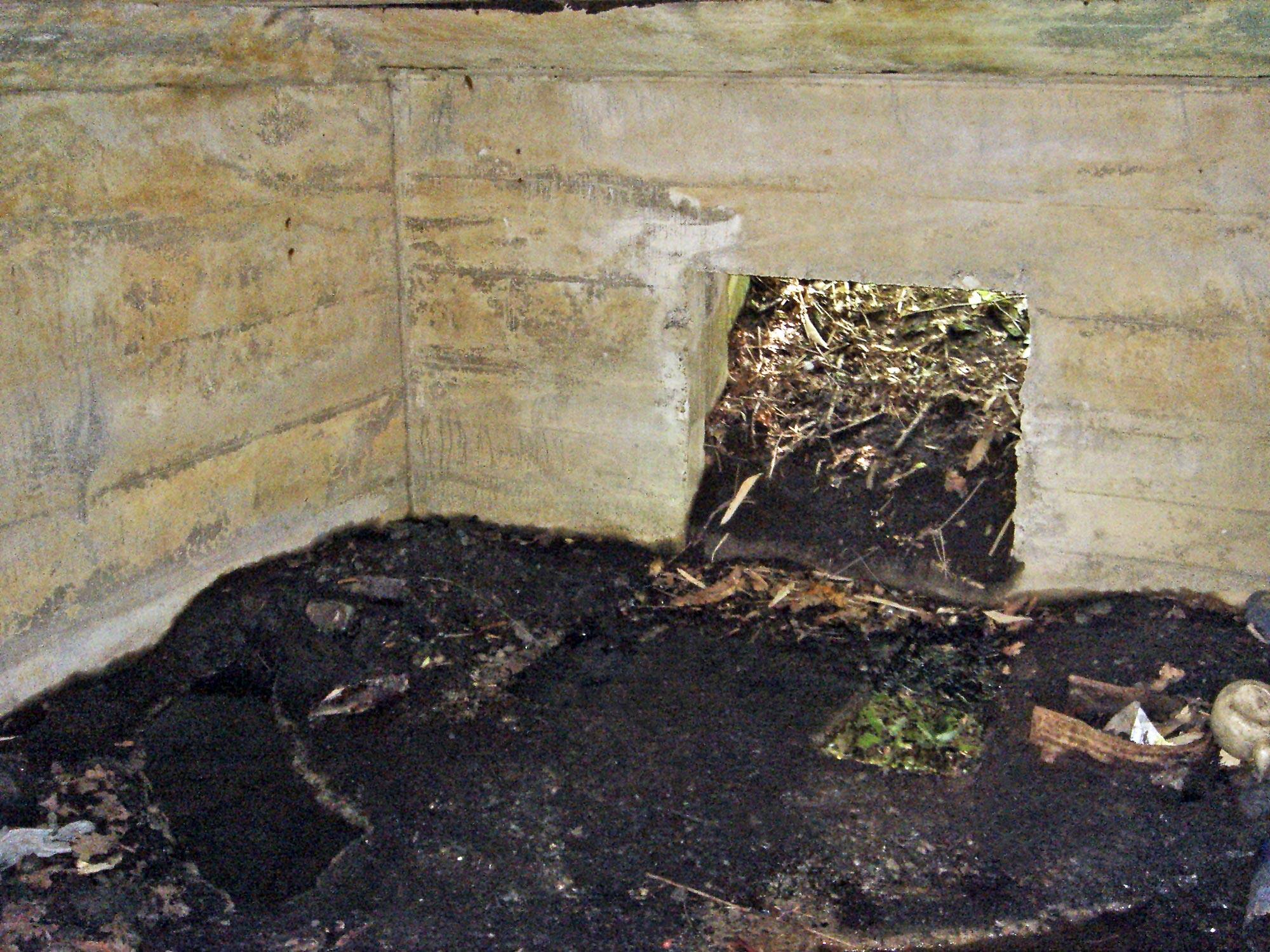 火砲の出し入れを考慮して、背面出入口の幅は広い。不法投棄されたゴミの右側に、砲側庫がある。